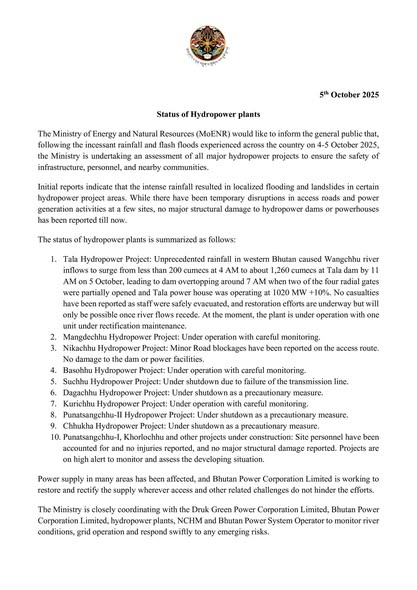 The Ministry of Energy and Natural Resources (MoENR) would like to inform the general public that, following the incessant rainfall and flash floods experienced across the country on 4-5 October 2025, the Ministry is undertaking an assessment of all major hydropower projects to ensure the safety of infrastructure, personnel, and nearby communities.